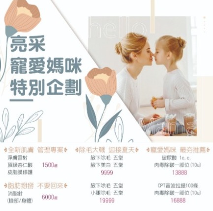 肌膚專案 ⇢ 淨膚、杏仁酸、皮脂膜1500起 脂肪掰掰 ⇢ 消脂治療 6000起 迎接夏天 ⇢ 除毛兼美白專案 寵愛媽咪 ⇢ CPT電波+肉毒 16888 凍齡媽咪 ⇢ 玻尿酸+肉毒 13888 諮詢專線:02-2649-9261 地址:新北市汐止區大同路二段376號2樓