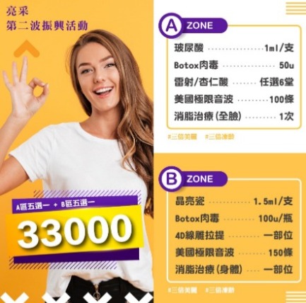 ☑任選 ☑任搭 ☑高達25種組合 A區五選一+B區五選一 ✶33000✶ ♜保證原廠原裝正貨 ♜醫師親自施打操作 ♜立即擁有完美自信