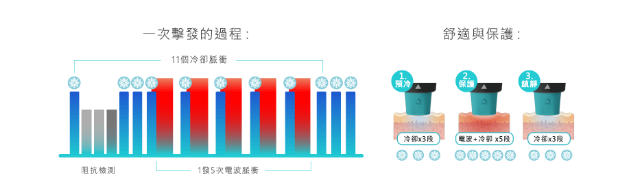 透過增強的冷卻噴霧保護表皮,減輕痛感,將電波能量傳遞更深療效顯著提升。5段的冷卻設計,2段的前噴能有效保護表皮,隨後的3段冷卻可避免過熱或灼傷,並提供舒適感。